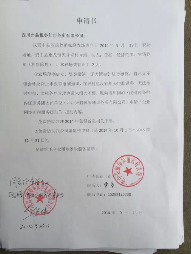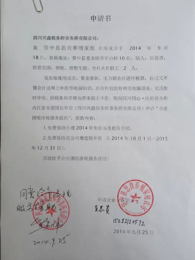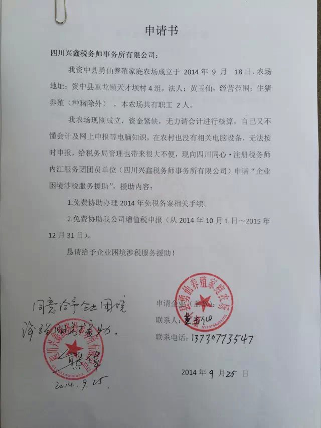 為托起困境企業(yè)騰飛的翅膀,為解決當(dāng)?shù)囟悇?wù)分局征管上的難題,四川同心·注冊(cè)稅務(wù)師服務(wù)團(tuán)團(tuán)員單位(四川興鑫稅務(wù)師事務(wù)所有限公司)愿為這些請(qǐng)不起會(huì)計(jì)、又無(wú)力自行申報(bào)的農(nóng)庭農(nóng)場(chǎng)進(jìn)行涉稅服務(wù)免費(fèi)援助。目前共20戶家庭農(nóng)場(chǎng)申請(qǐng)了困境企業(yè)涉稅服務(wù)免費(fèi)扶助(詳見(jiàn)后附申請(qǐng)書(shū))